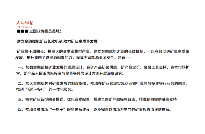 全國政協(xié)委員吳城:建立金融賦能礦業(yè)長效機制 助力礦業(yè)高質(zhì)量發(fā)展